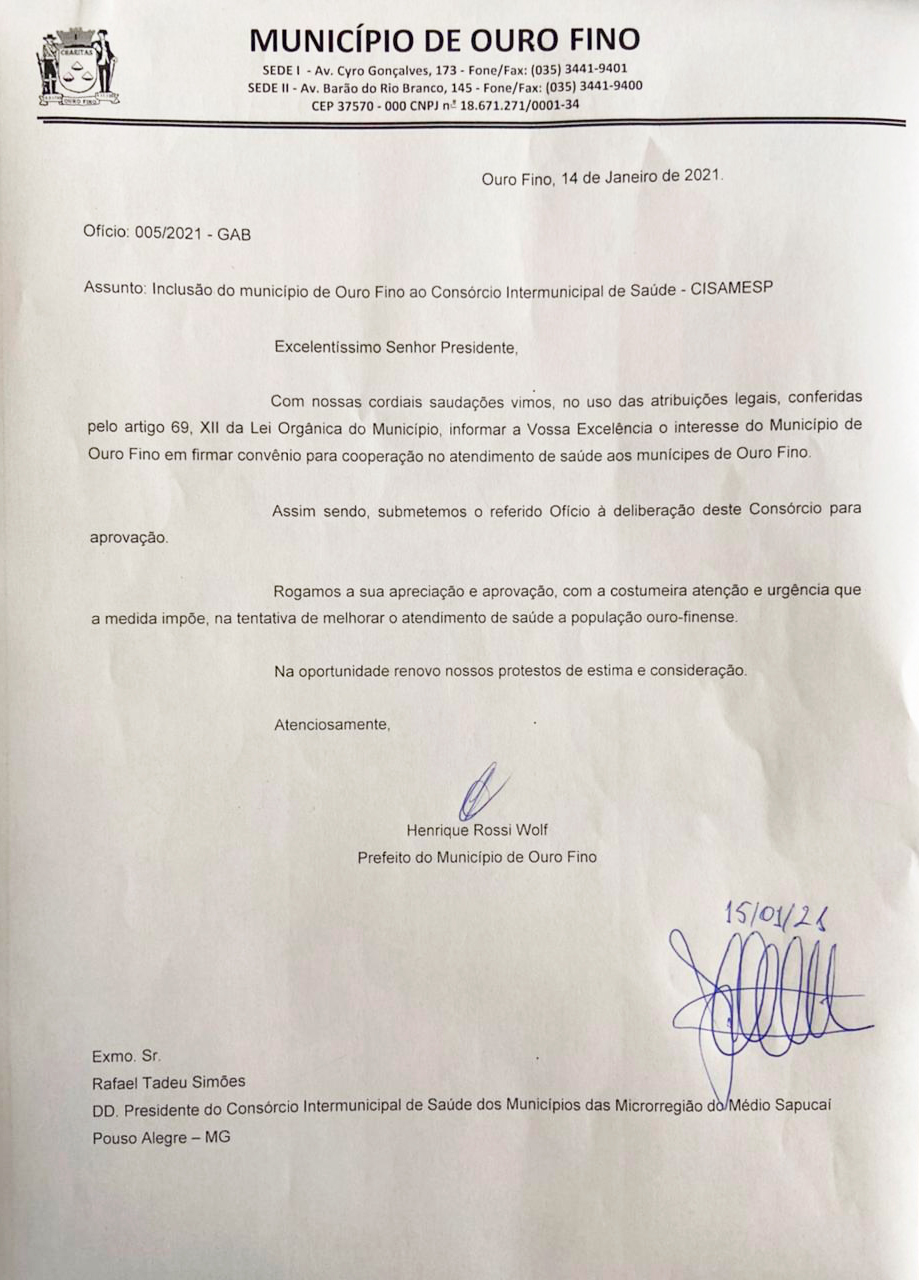 O pedido será encaminhado a diretoria da Cisamesp para deliberação e aprovação da reinclusão de Ouro Fino ao consórcio.