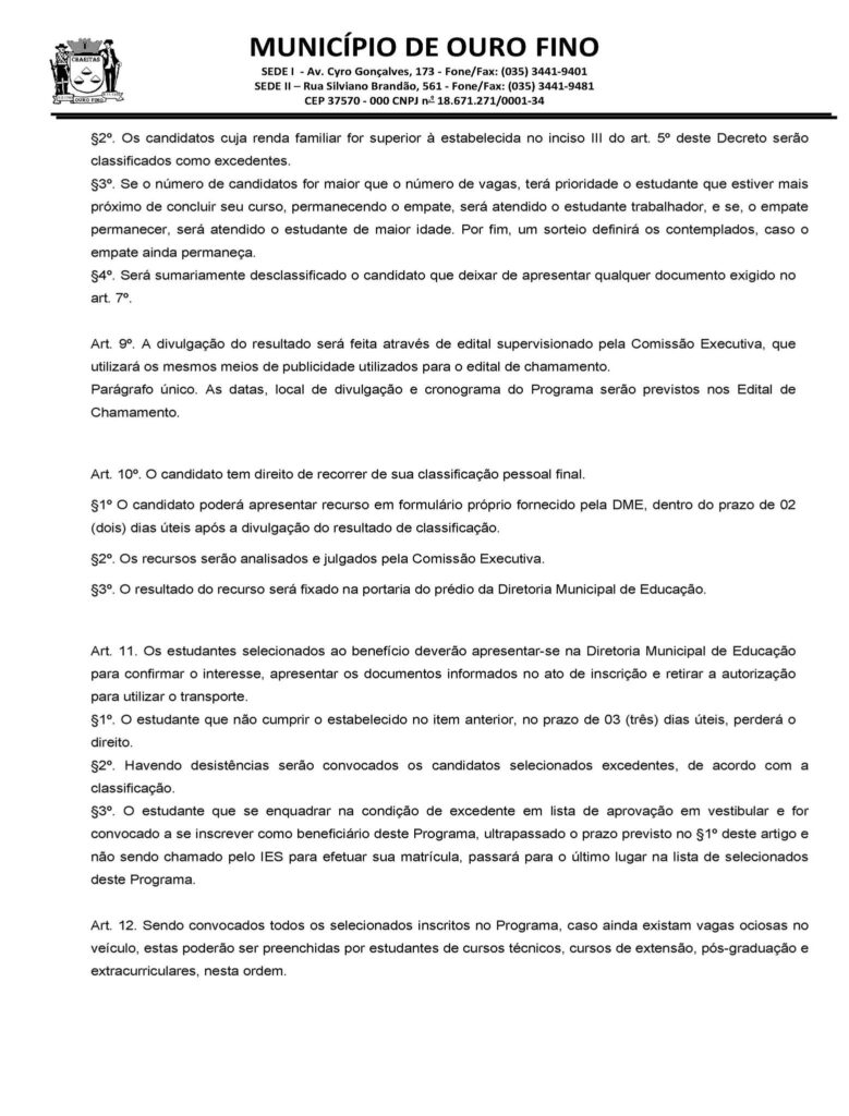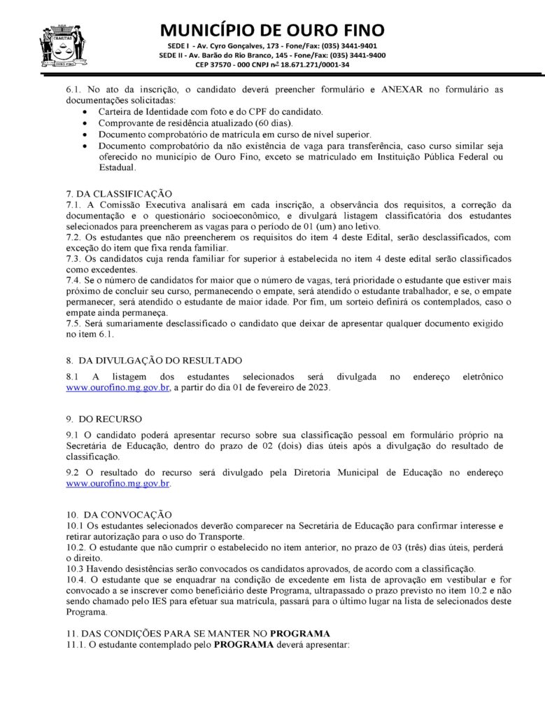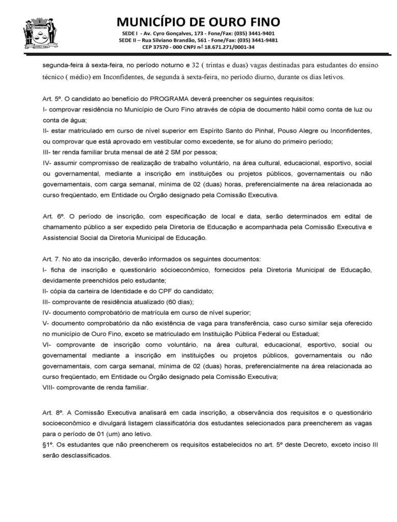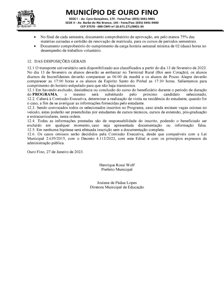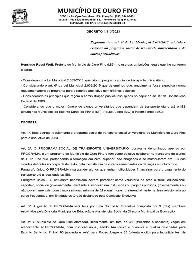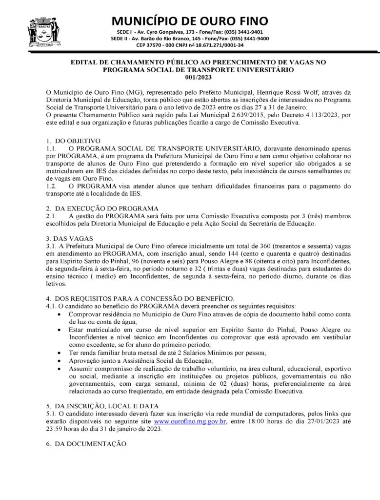 PREFEITURA DE OURO FINO ABRE INSCRIÇÕES PARA PROGRAMA SOCIAL DE TRANSPORTE UNIVERSITÁRIO GRATUITO.