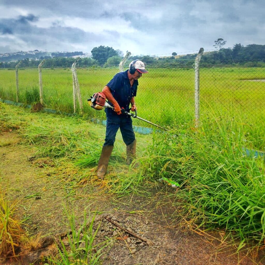 , a equipe realizou a limpeza do Bairro Jardim Aeroporto com o auxílio de roçadeiras, o que garantiu a retirada de entulhos e o embelezamento da região.