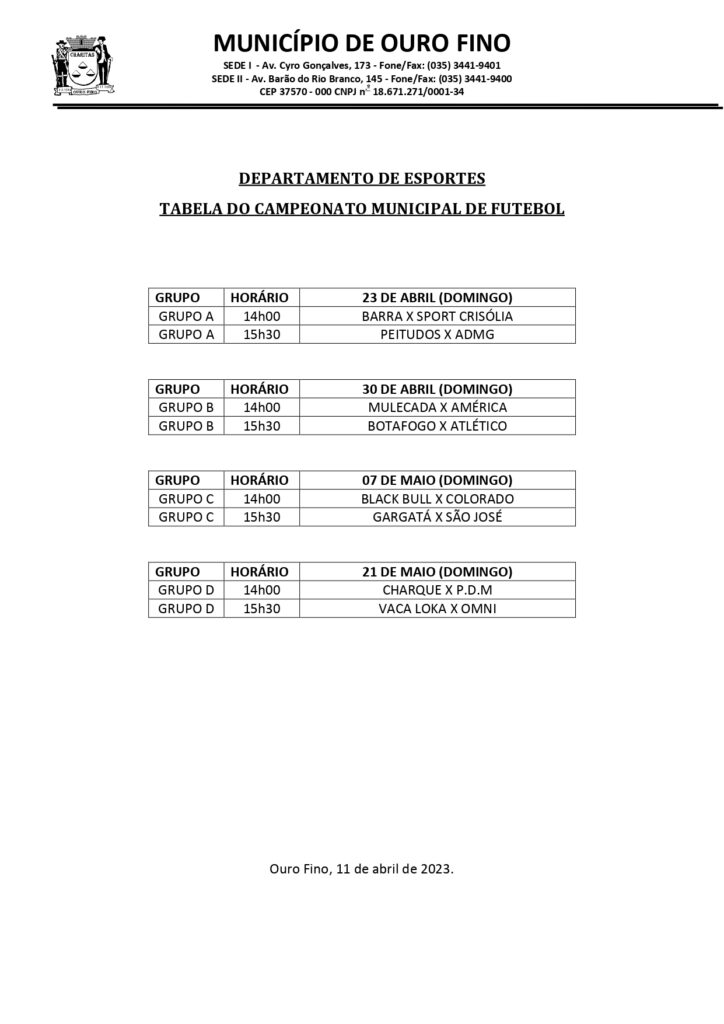 O Departamento de Esporte da Prefeitura de Ouro Fino divulga nesta semana a programação dos jogos que serão realizados no mês de abril no município. A primeira rodada será no dia 23 de Abril, com jogos marcados para as 14h e 15h30 no estádio Municipal Capitão Armando.