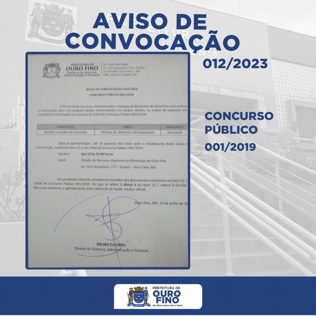 A Prefeitura de Ouro Fino, através da Diretoria de Governo Administração e Finanças, convoca os candidatos que participaram do processo seletivo 002/2023 e do concurso público 001/2019, a comparecerem na Divisão de RH.
