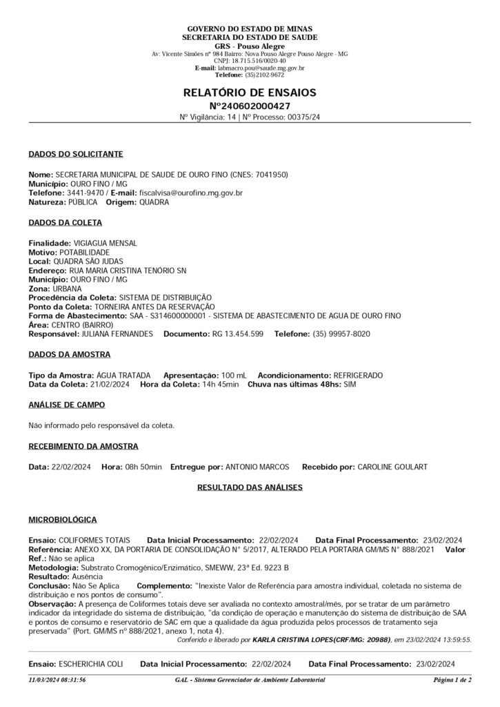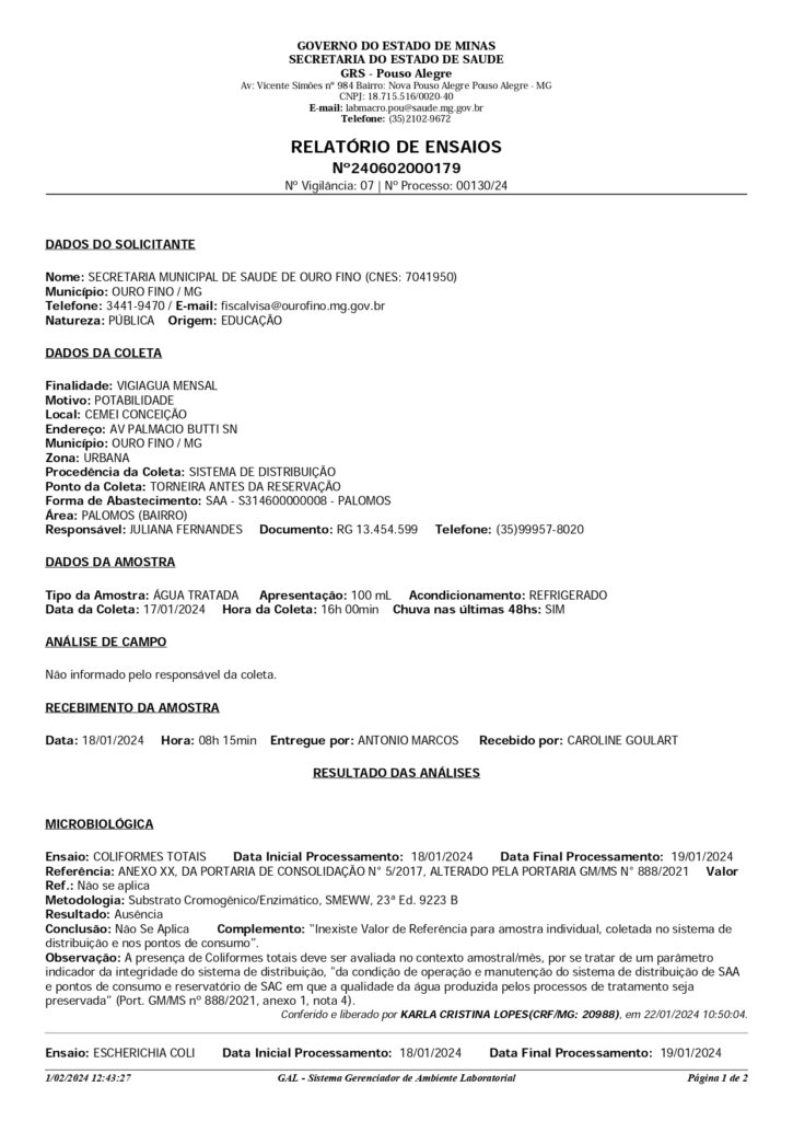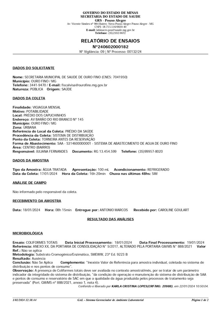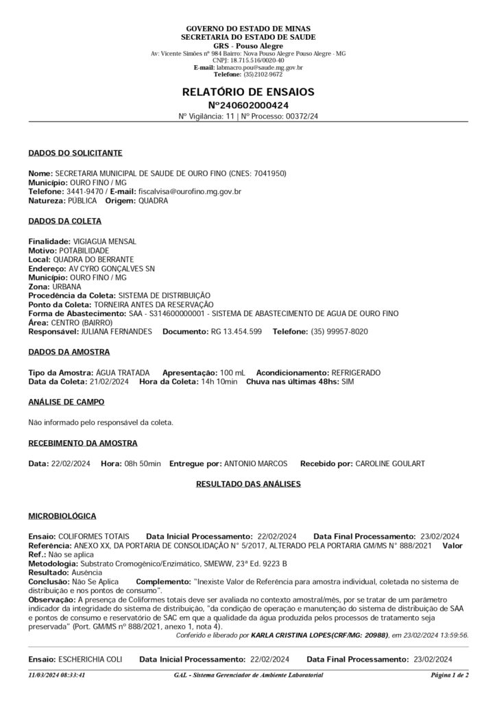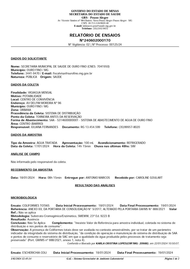 A diretoria de saúde e a vigilância sanitária divulgaram os laudos das análises das amostras de água das minas e bebedouros de escolas e departamentos municipais. Em nenhuma amostra foi detectada a presença de microorganismos que possam comprometer a qualidade da água.
