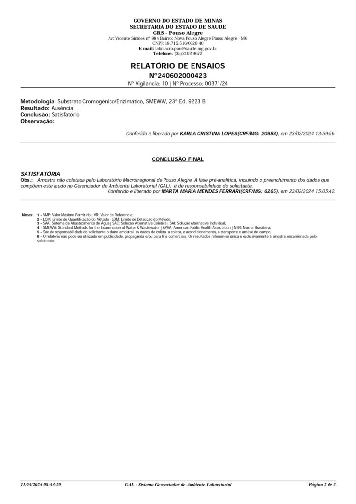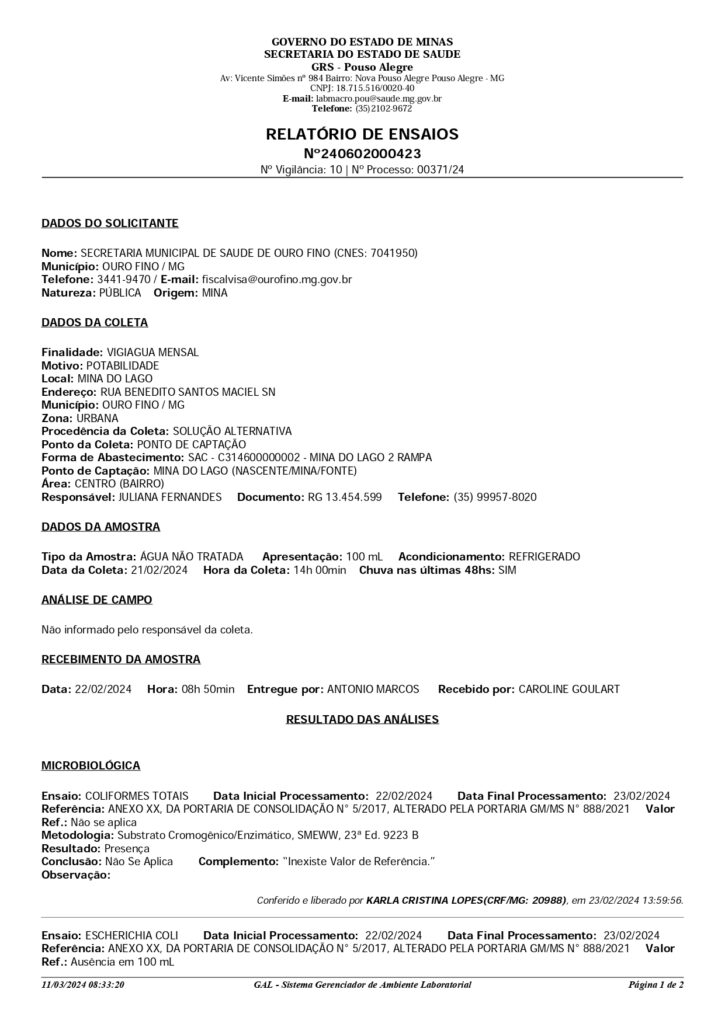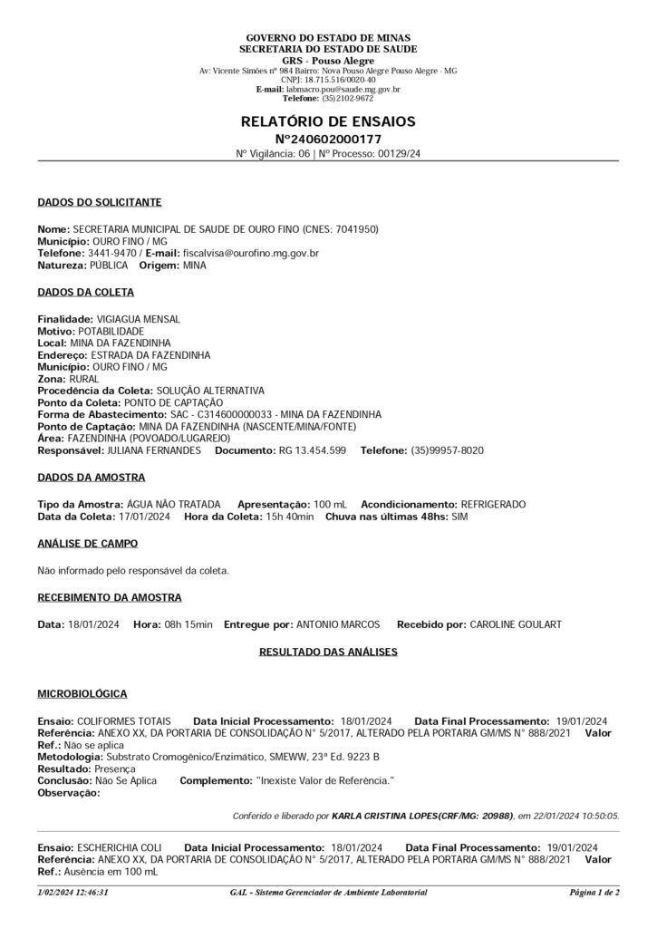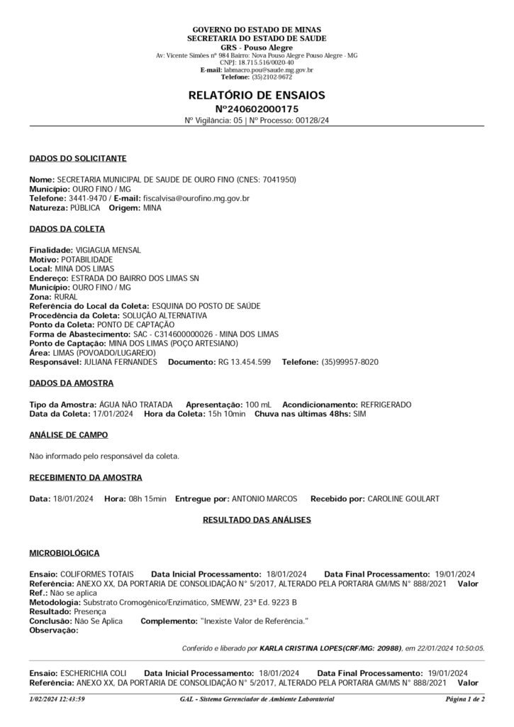 RESULTADO DA ANÁLISE DE ÁGUAS DAS MINAS DO MUNICÍPIO