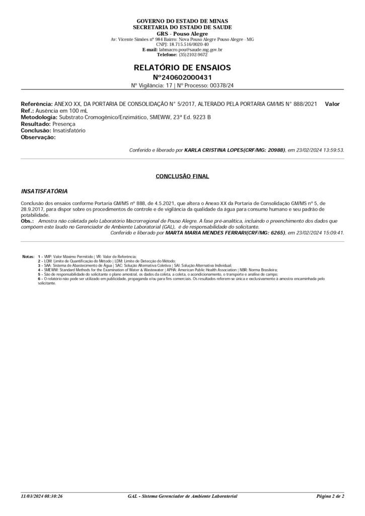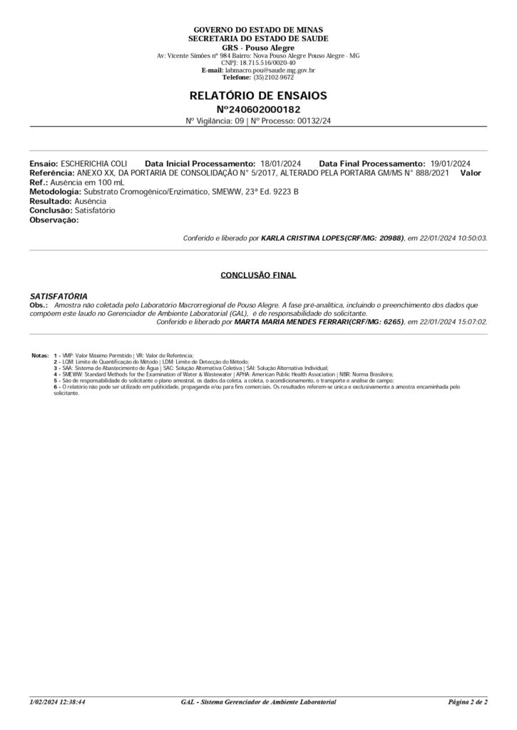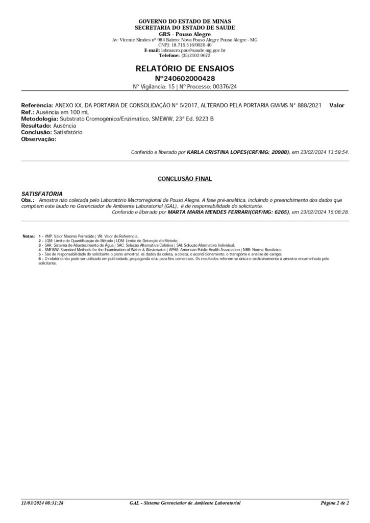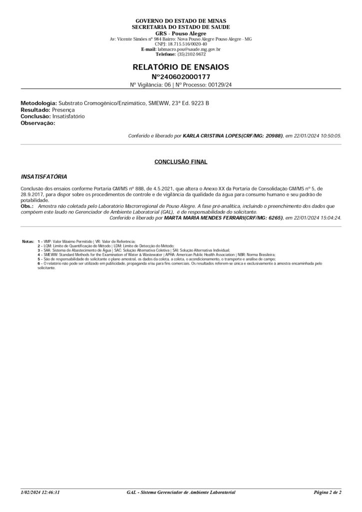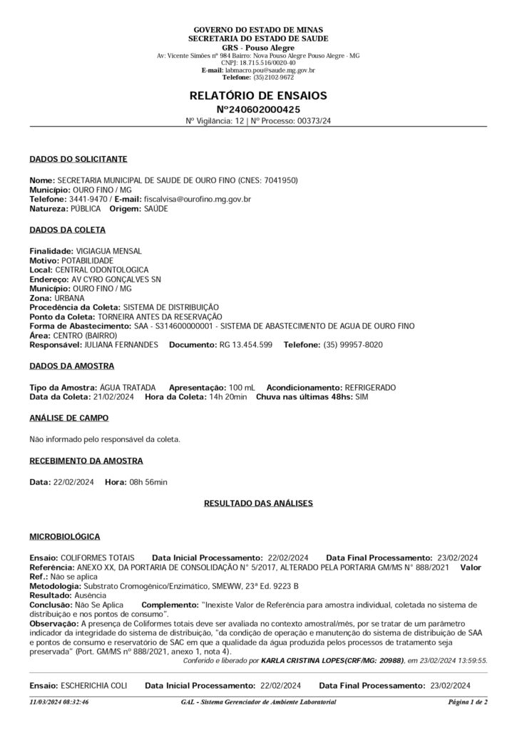 RESULTADO DA ANÁLISE DE ÁGUAS DAS MINAS DO MUNICÍPIO