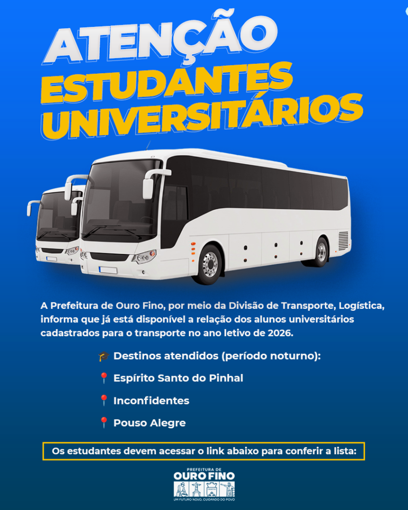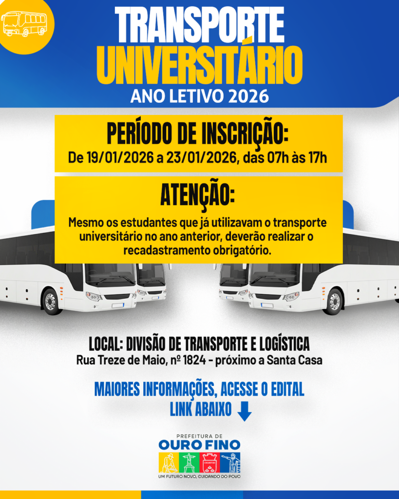 Destaque, Educação, Notícias ATENÇÃO, ESTUDANTES UNIVERSITÁRIOS – TRANSPORTE 2026 30/01/2026 Continue reading