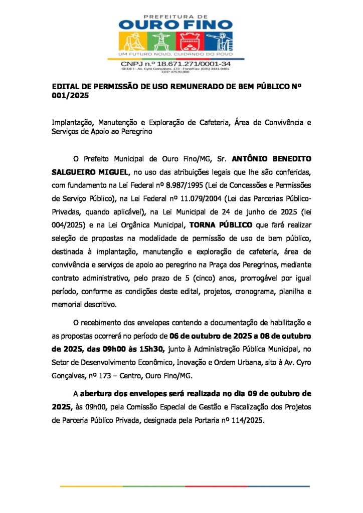 Administrativo, Notícias Prefeitura de Ouro Fino publica Edital de Permissão de Uso da Praça do Peregrino 30/09/2025 Continue reading