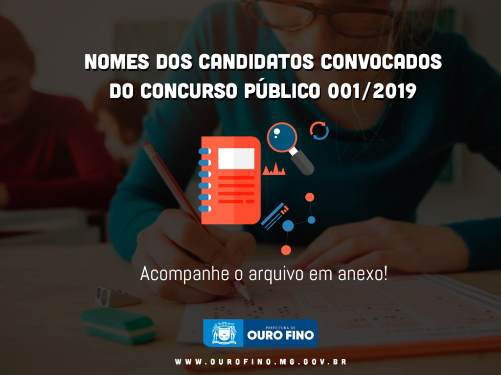 A Prefeitura de Ouro Fino, por meio do Departamento de Recursos Humanos, divulga em anexo os nomes dos candidatos convocados do Concurso Público 001/2019.