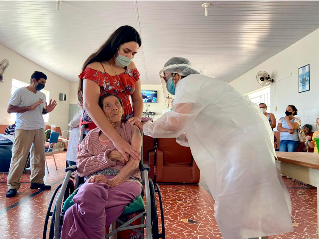 A primeira idosa a receber a vacina foi dona Maria Eunice de Souza de 99 anos. Ao todo 60 idosos e 35 funcionários foram imunizados.