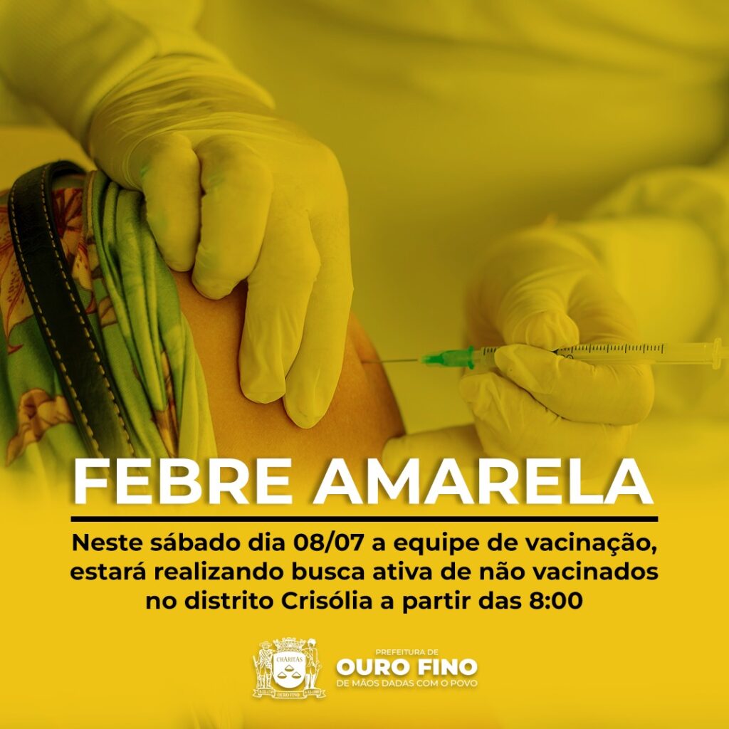 Limpeza, Notícias A PREFEITURA DE OURO FINO JUNTAMENTE COM O DEPARTAMENTO DE SAÚDE, IRÁ REALIZAR VACINAÇÃO DA FEBRE AMARELA NESTE SÁBADO EM CRISÓLIA. 10/07/2023 Continue reading