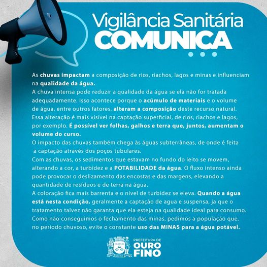 Notícias VIGILÂNCIA SANITÁRIA FAZ ALERTA PARA O USO DE ÁGUA DAS MINAS NO PERÍODO CHUVOSO 24/01/2024 Continue reading